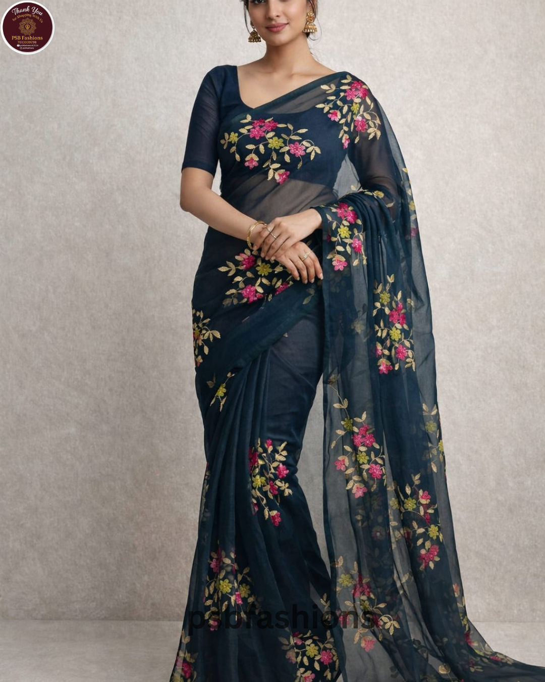 An elegant navy-blue sheer georgette saree adorned with delicate pink and green floral embroidery. Light, graceful, and timeless, it drapes beautifully and is perfect for evening parties, festive occasions, and formal gatherings. The soft floral motifs add a romantic charm while maintaining a sophisticated look