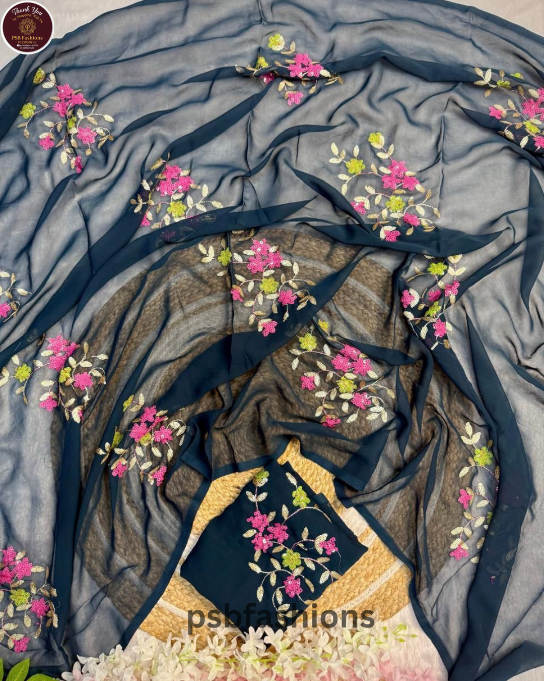 🌸 Midnight Bloom Embroidered Georgette Saree