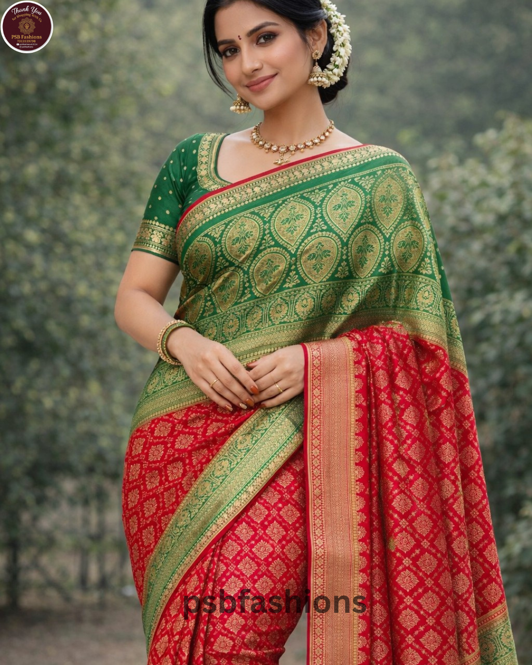 A traditional silk saree featuring a rich green and red color combination with intricate gold zari motifs and a regal woven border—perfect for weddings and festive occasions.