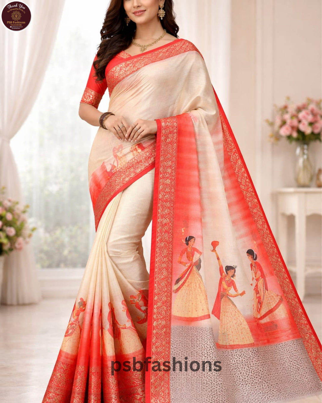 Beautiful cream saree with coral red shaded pallu and border, featuring elegant folk dancer prints and floral detailing. Lightweight and graceful, perfect for daily wear, casual outings, and festive occasions.