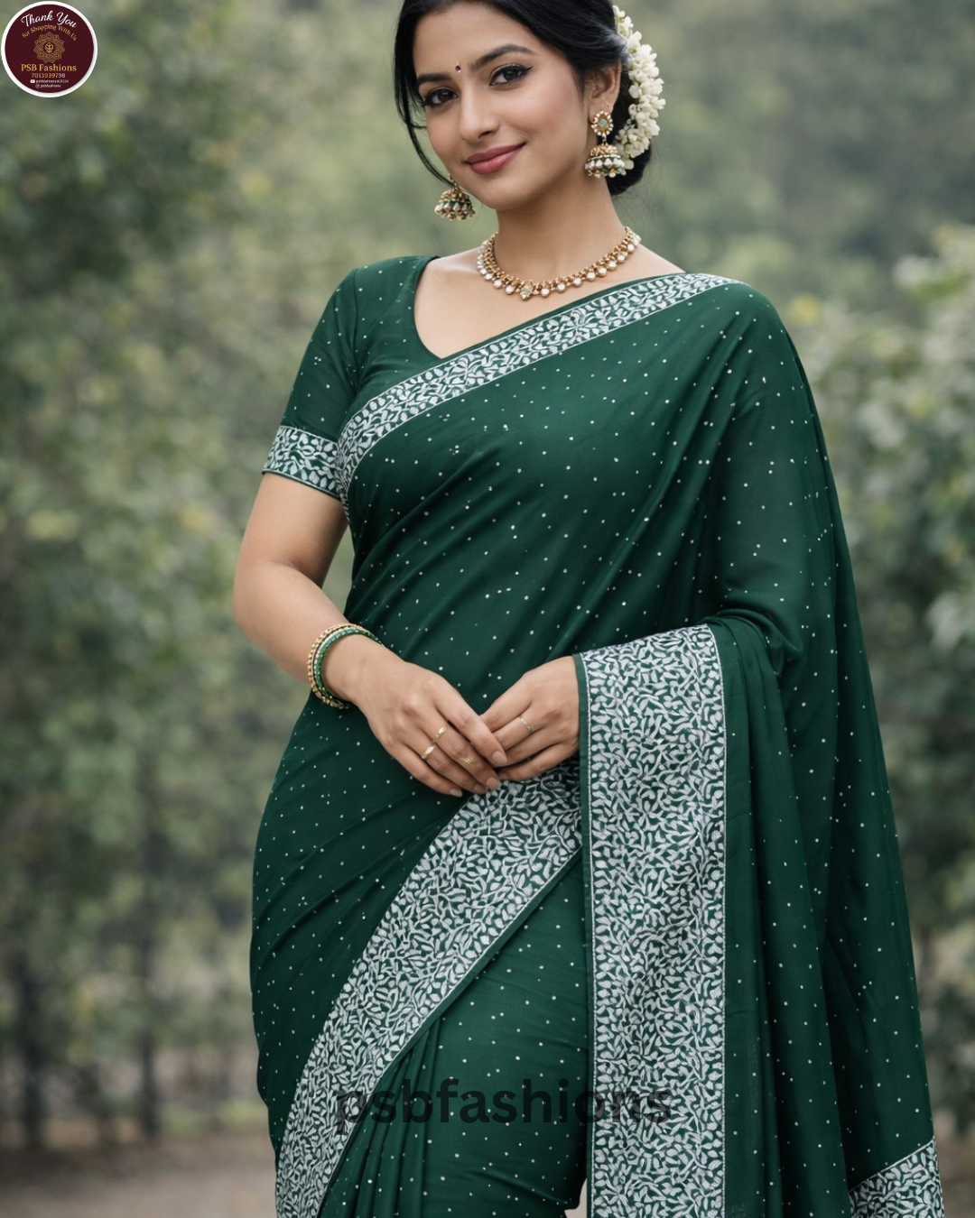 A graceful saree in deep emerald green featuring delicate dotted prints and a contrasting leafy patterned border, offering a refined and elegant look ideal for everyday elegance and festive wear.