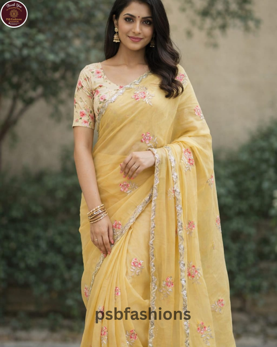 Elegant mustard-yellow chiffon saree featuring delicate pink floral embroidery with a shimmering silver lace border. Lightweight, graceful, and perfect for festive occasions, parties, and daytime functions. Comes with a matching floral printed blouse piece.