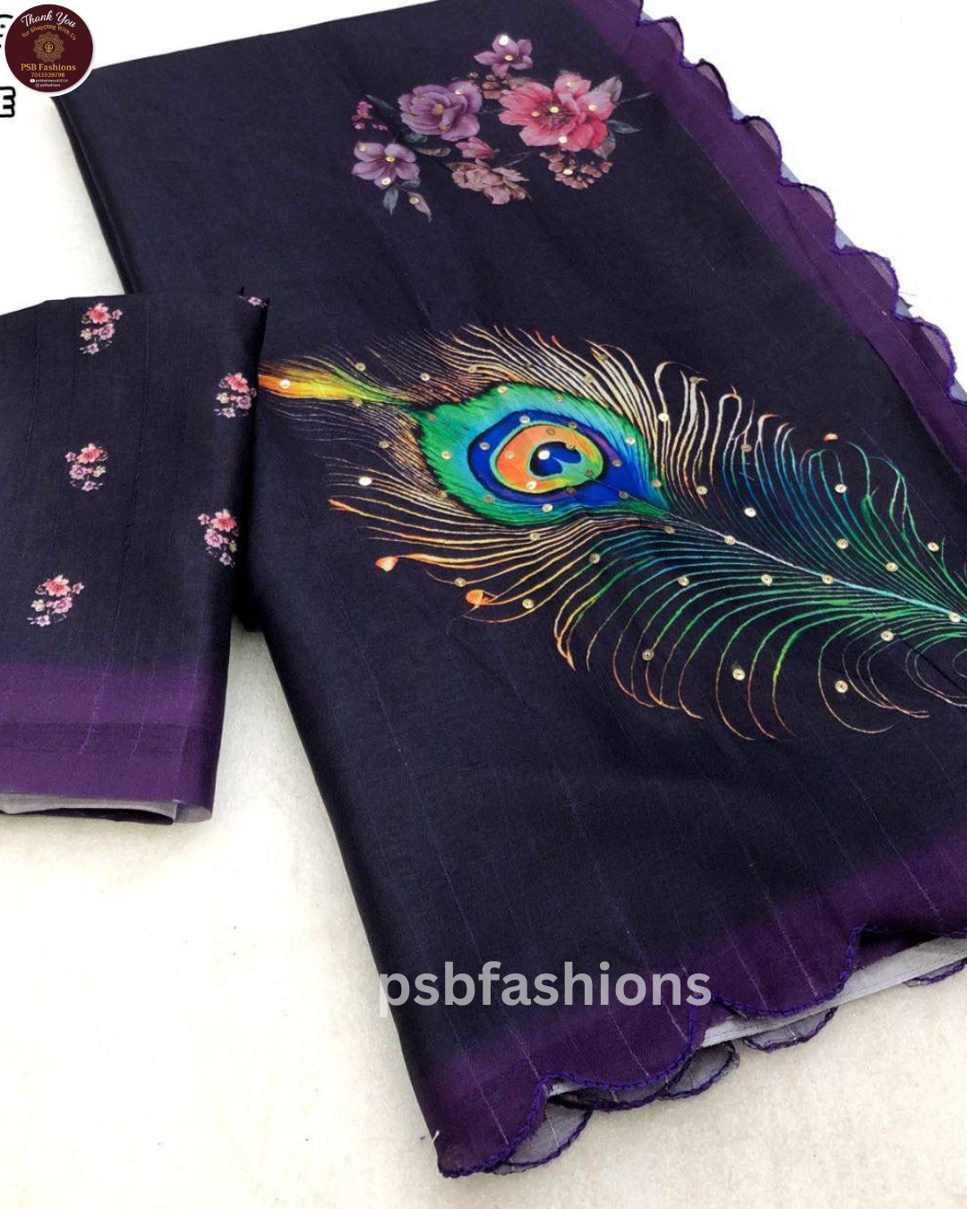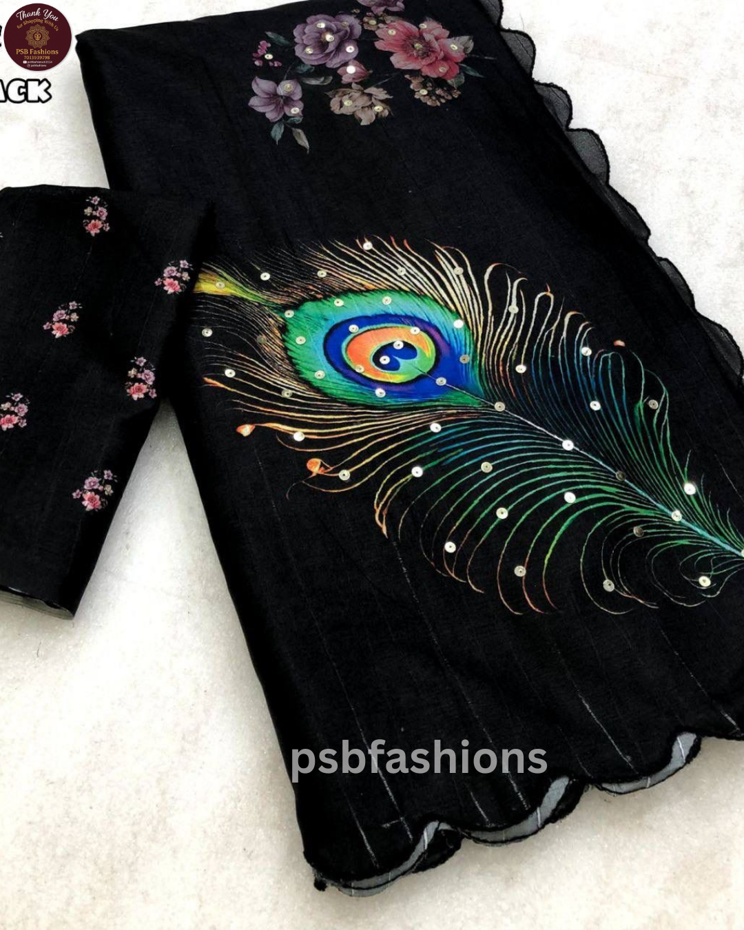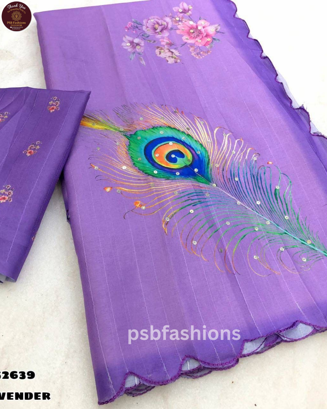 HIT DESIGN RESTOCKED😍 Fabric – Handloom tussar silk with peacock feather digital print comes with sequence work & embroidered scalloped cutwork border Blouse – printed blouse Just at – ₹970+$ Quality Guaranteed
