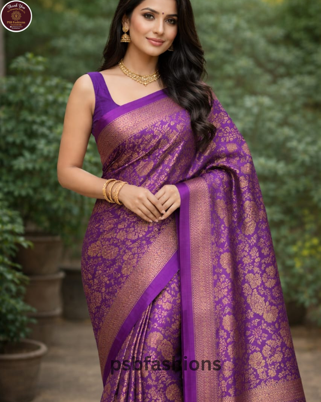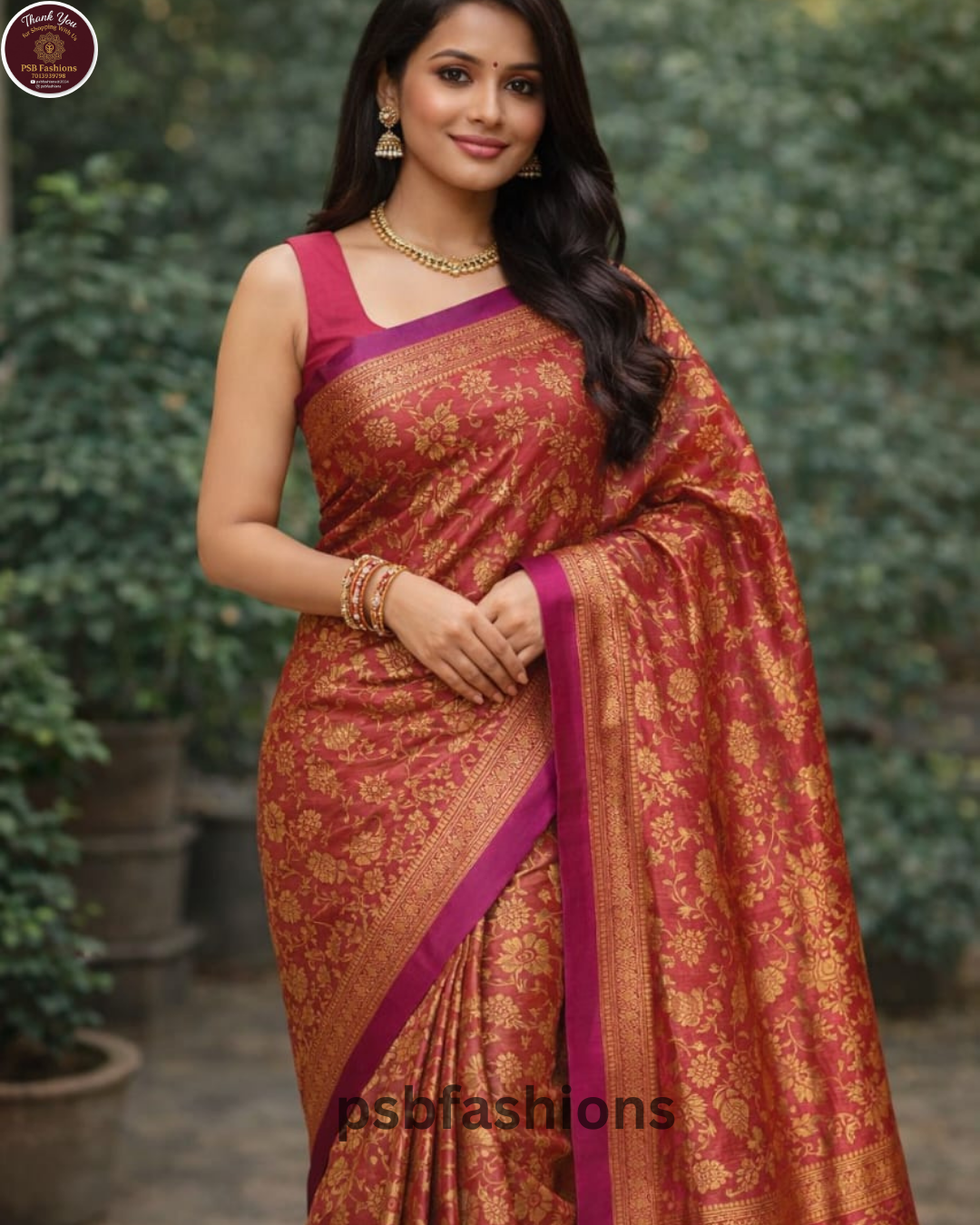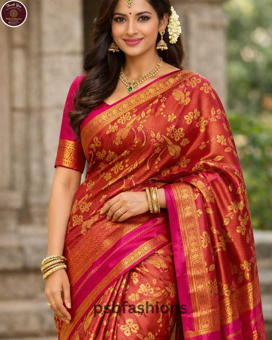 A rich traditional Kanchipuram silk saree in deep maroon with intricate gold zari peacock and floral motifs, highlighted by a contrasting magenta border. Known for its lustrous silk, heavy zari work, and timeless elegance, it is perfect for weddings, festivals, and grand occasions.