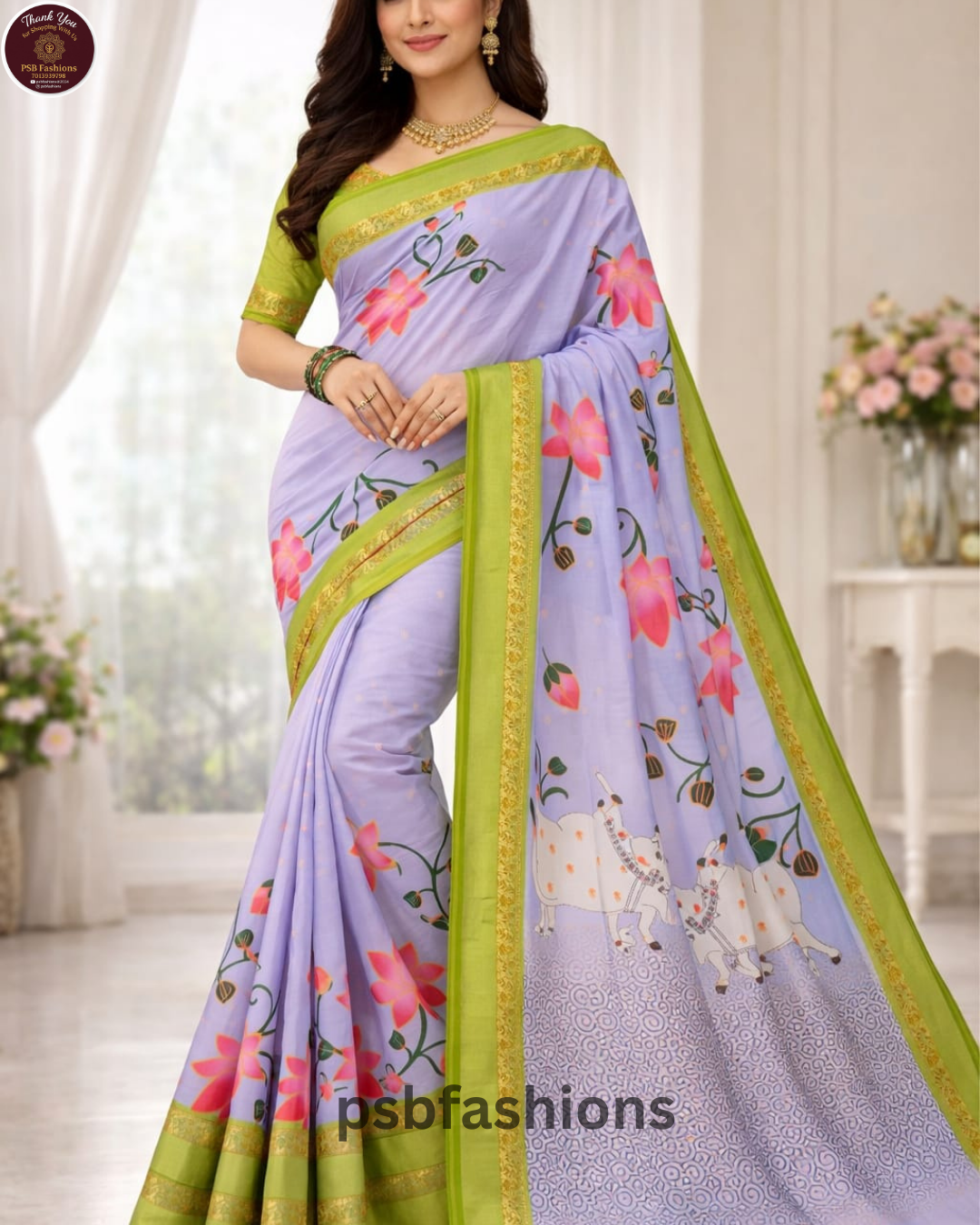 Graceful lavender saree with vibrant pink lotus prints, traditional cow motifs, and a fresh green border with golden detailing. Lightweight and elegant, ideal for daily wear, casual outings, and festive occasions.