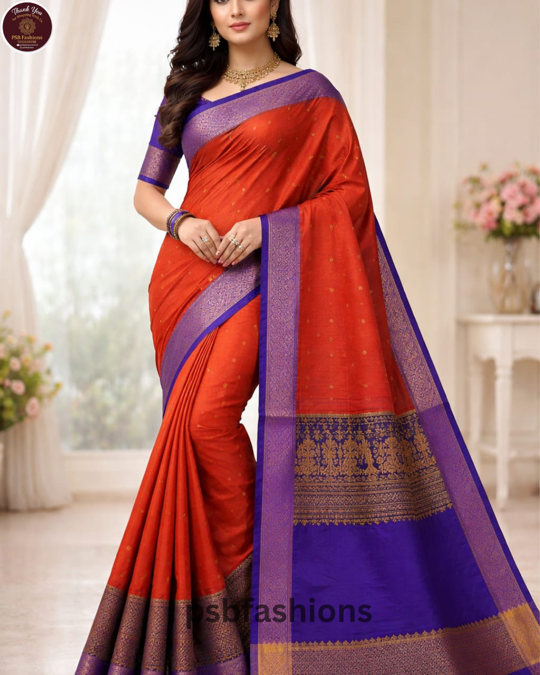 This elegant saree features a rich rust orange body beautifully contrasted with a royal blue border and pallu, highlighted by intricate gold zari weaving. The saree is adorned with small traditional motifs across the body and a detailed floral zari design on the pallu, giving it a classic and graceful look.