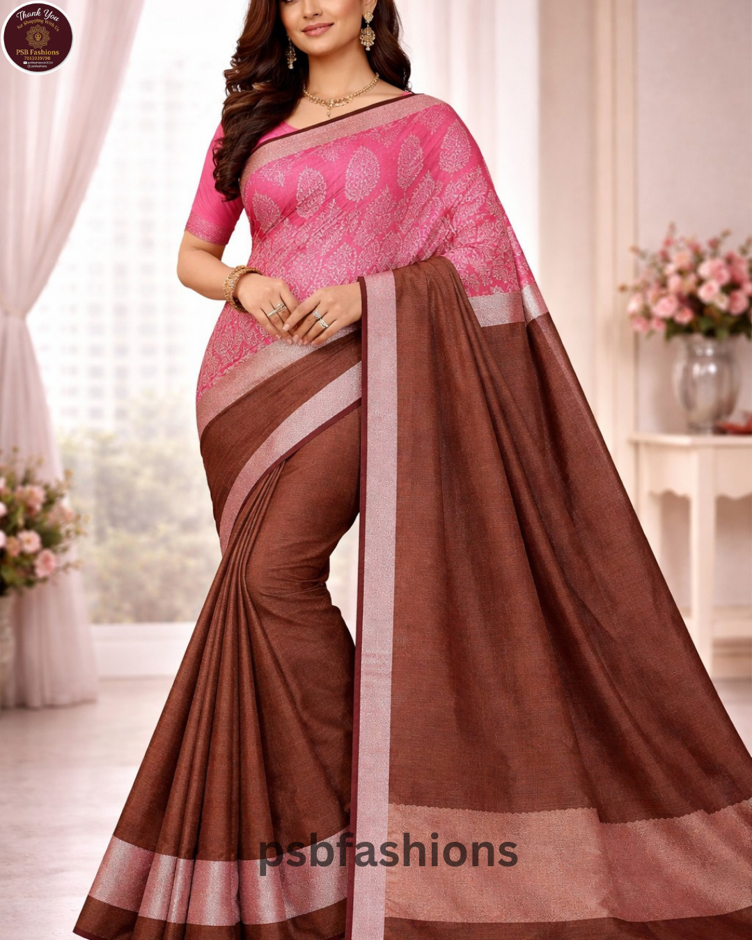 An elegant silk saree featuring a soft rose-pink patterned upper drape paired with a rich brown body and subtle silver zari borders, offering a refined and graceful look for festive and formal occasions.